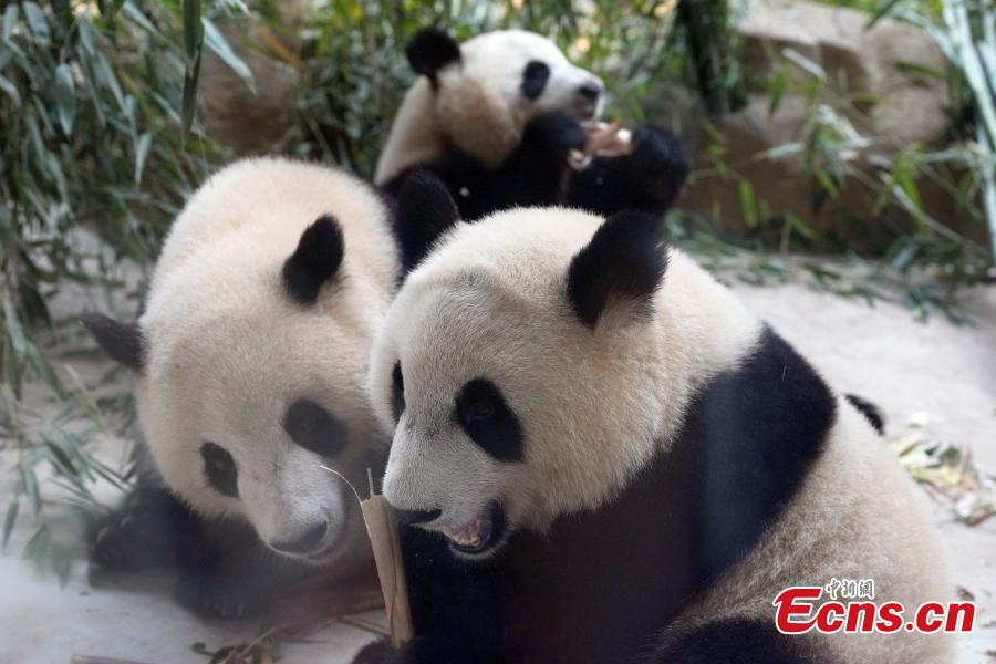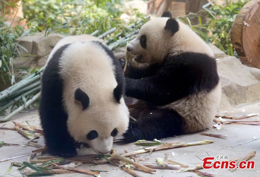 Giant pandas enjoy bamboo shoots at the Chengdu Research Base of Giant Panda Breeding, southwest China's Sichuan Province, May 22, 2024. (Photo: China News Service/An Yuan)