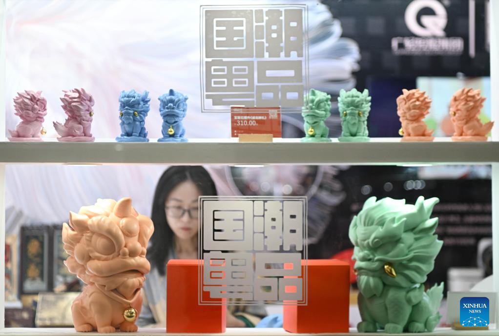 A visitor views exhibits related with Guochao, also known as Chinese trends or "China chic," during the 20th China (Shenzhen) International Cultural Industries Fair (ICIF) at the Shenzhen World Exhibition and Convention Center, Shenzhen, south China's Guangdong Province, May 23, 2024. The 20th ICIF opened here on Thursday. According to the organizers, the five-day event held offline and online simultaneously has attracted over 6,000 government entities, cultural organizations and enterprises, with more than 120,000 exhibits on display. (Xinhua/Deng Hua)