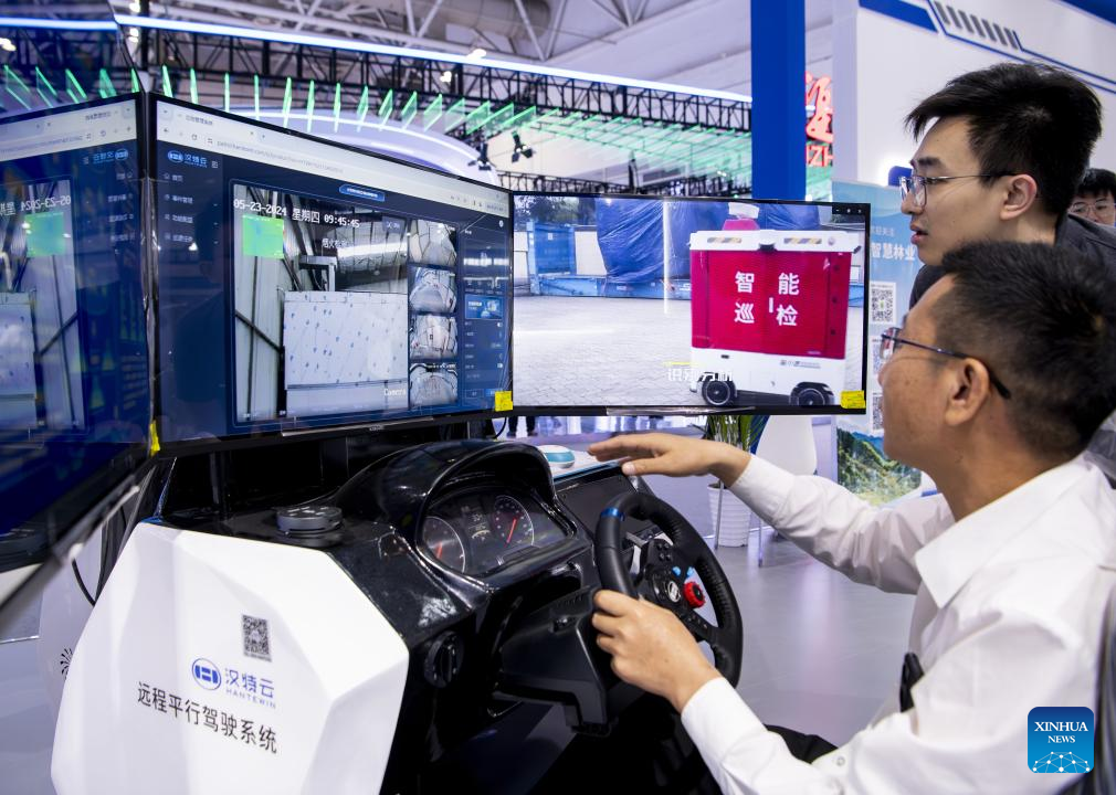 A visitor (R) tries remote parallel driving system at the on-site experience area for the 7th Digital China Summit in Fuzhou, southeast China's Fujian Province, May 23, 2024. The 7th Digital China Summit will take place in Fuzhou from May 24 to 25. The preview of its on-site experience area, covering an area of 56,000 square meters and consisting of five major parts, was opened at Fuzhou Strait International Conference and Exhibition Center on Thursday. (Xinhua/Wei Peiquan)