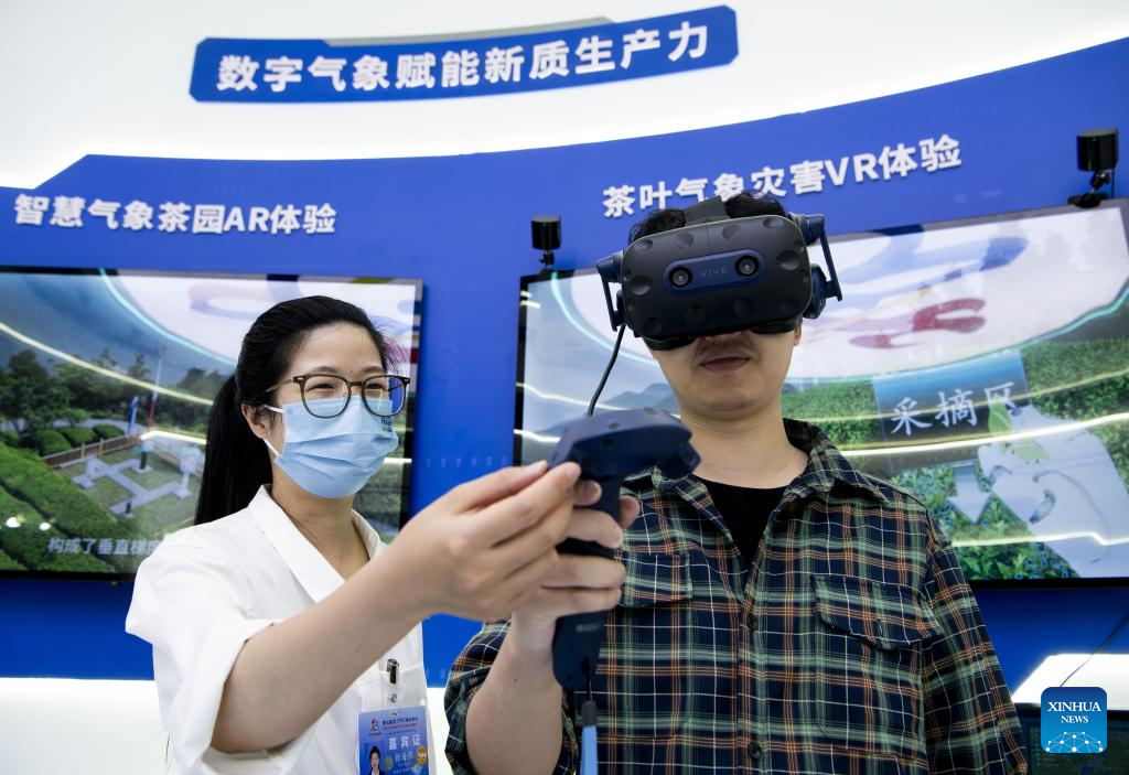 A visitor (R) tries digital VR devices at the on-site experience area for the 7th Digital China Summit in Fuzhou, southeast China's Fujian Province, May 23, 2024. The 7th Digital China Summit will take place in Fuzhou from May 24 to 25. The preview of its on-site experience area, covering an area of 56,000 square meters and consisting of five major parts, was opened at Fuzhou Strait International Conference and Exhibition Center on Thursday. (Xinhua/Wei Peiquan)