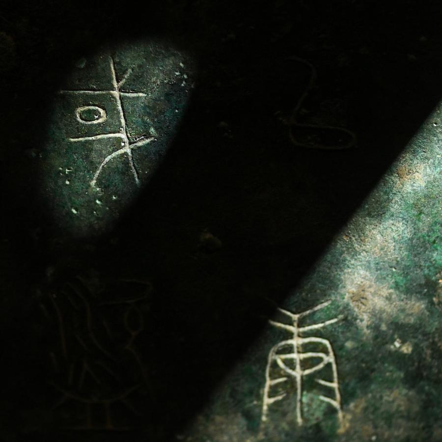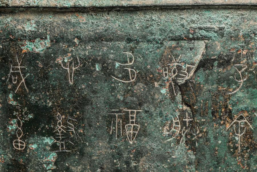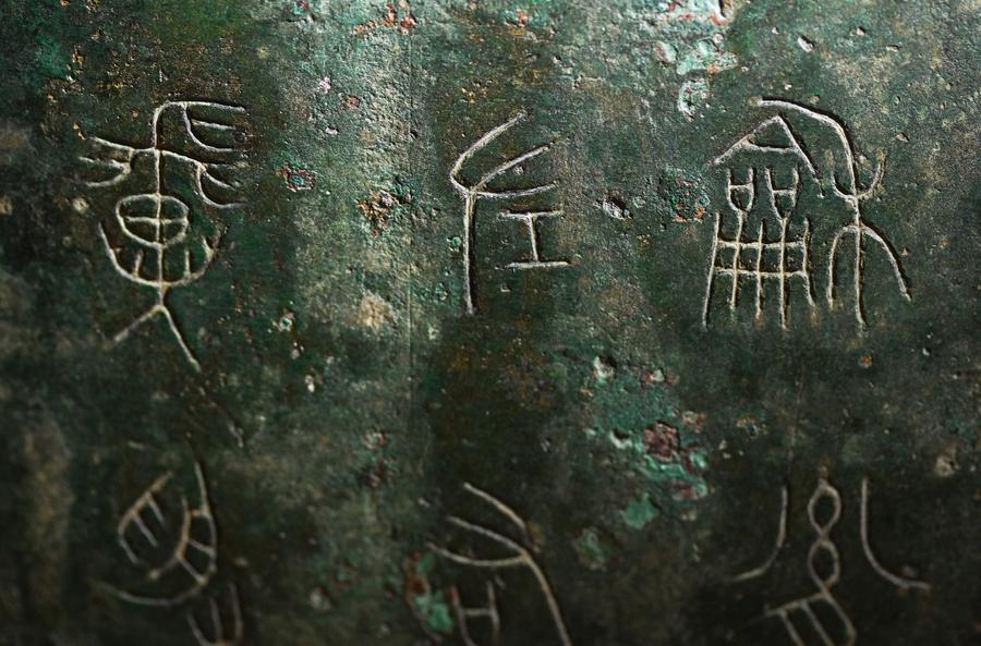 This photo taken on Jan. 23, 2024 shows part of the inscription on a piece of Qin Gong Bo at Baoji Bronze Ware Museum in Baoji, northwest China's Shaanxi Province. (Xinhua/Zou Jingyi)