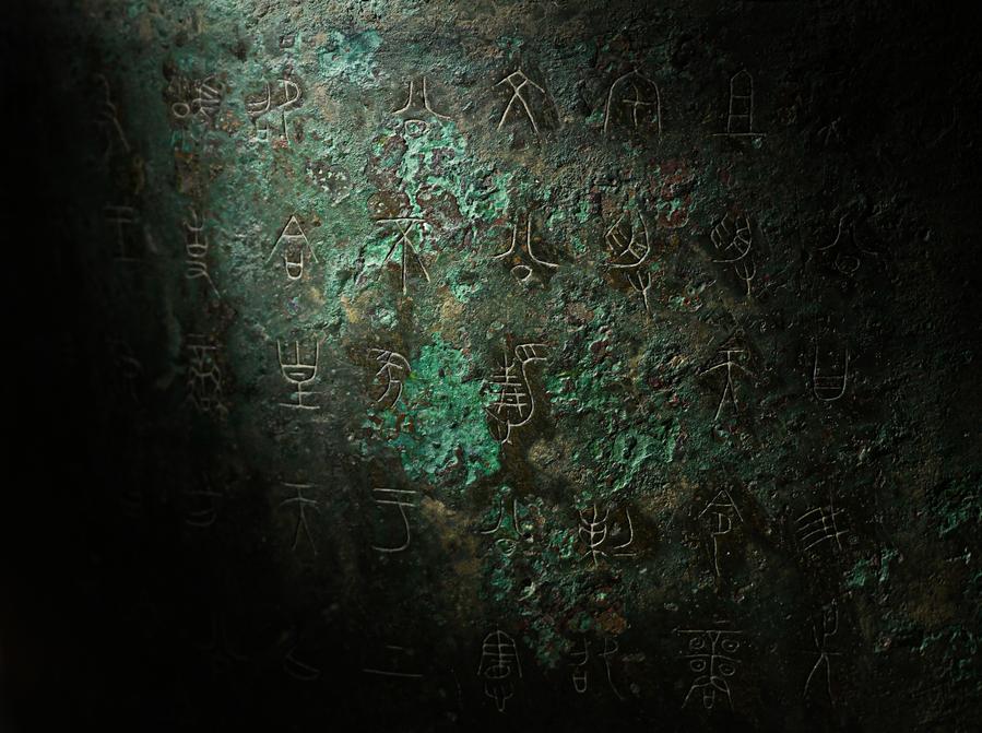 This photo taken on Jan. 23, 2024 shows part of the inscription on a piece of Qin Gong Bo at Baoji Bronze Ware Museum in Baoji, northwest China's Shaanxi Province. (Xinhua/Li He)