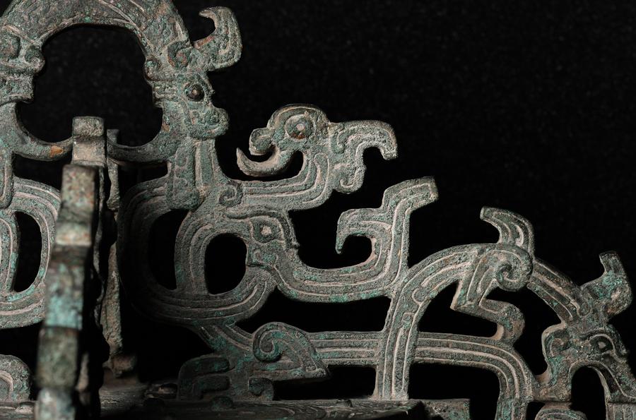 This photo taken on Jan. 23, 2024 shows the pattern of dragon on a piece of Qin Gong Bo at Baoji Bronze Ware Museum in Baoji, northwest China's Shaanxi Province. (Xinhua/Li He)