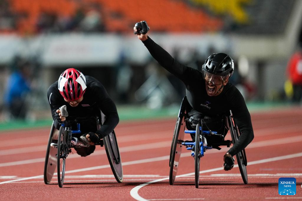 Faisal Alrajehi (R) of Kuwait celebrates after Men's 5000m T54 Final at the Para Athletics World Championships held in Kobe, Japan, May 23, 2024. (Xinhua/Zhang Xiaoyu)