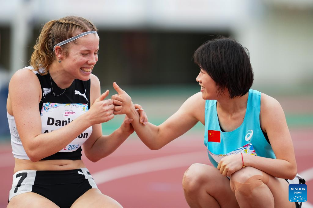 Shi Yiting (R) of China celebrates with Danielle Aitchison of New Zealand after Women's 200m T36 Final at the Para Athletics World Championships held in Kobe, Japan, May 23, 2024. (Xinhua/Zhang Xiaoyu)