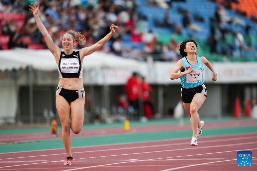 Shi Yiting (R) of China and Danielle Aitchison of New Zealand compete during Women's 200m T36 Final at the Para Athletics World Championships held in Kobe, Japan, May 23, 2024. (Xinhua/Zhang Xiaoyu)