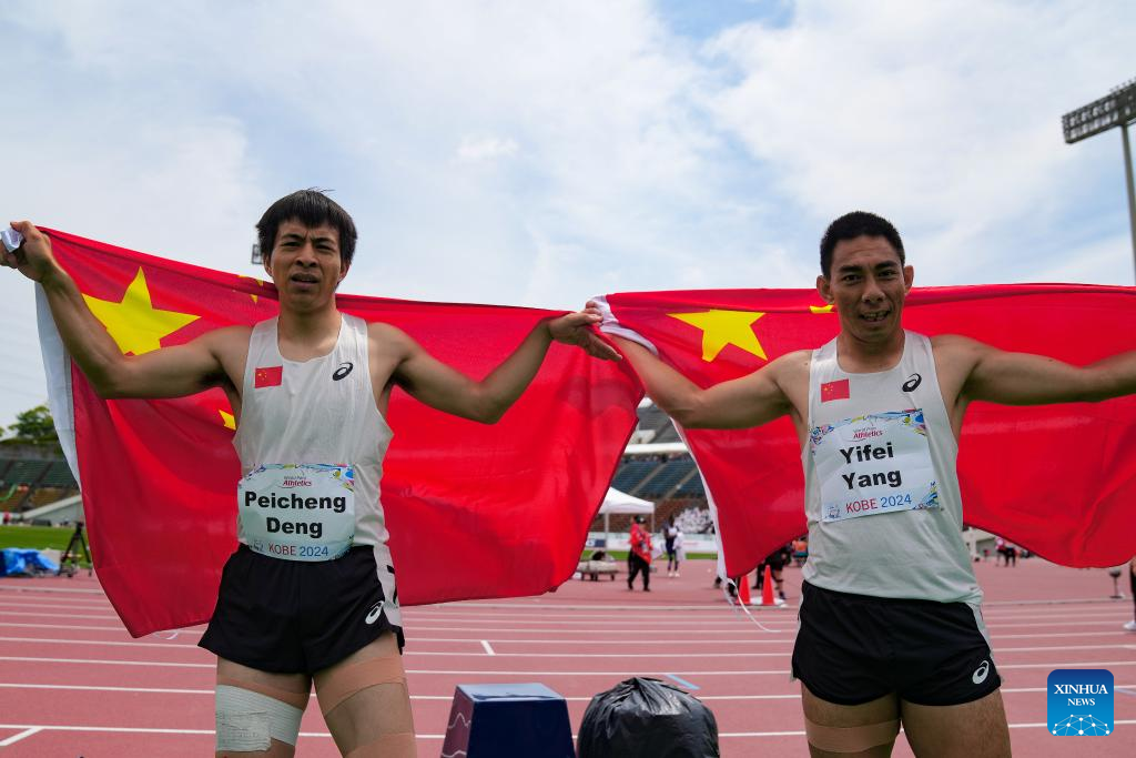 Silver medalist Yang Yifei (R) and gold medalist Deng Peicheng of China pose for photos after Men's 100m T36 Final at the Para Athletics World Championships held in Kobe, Japan, on May 23, 2024. (Xinhua/Zhang Xiaoyu)