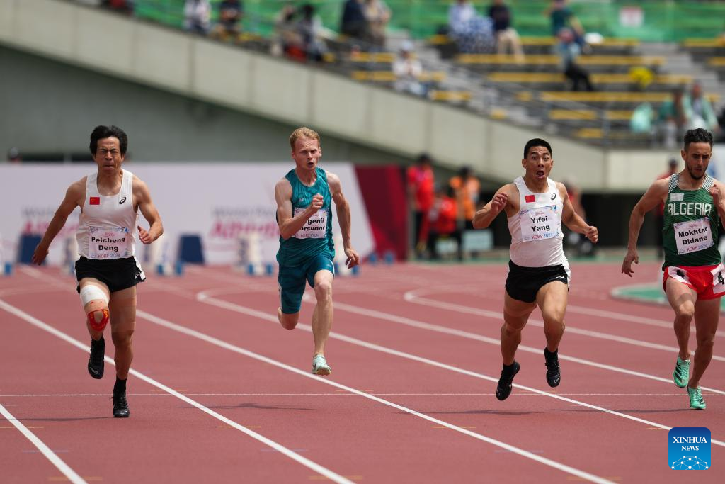 The men's 100m finals saw Deng Peicheng of T36 class clinch gold by clocking 11.95 seconds, with his teammate Yang Yifei finishing the second. In the T11 category of men's 100m finals, Di Dongdong won with 11.28 seconds while Ye Tao got the silver.