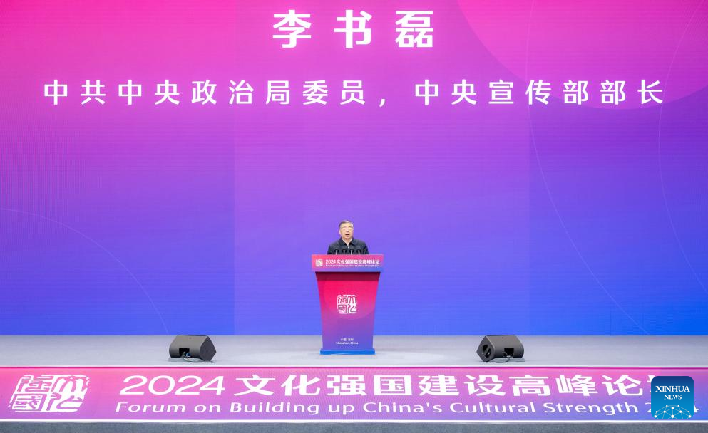 Li Shulei, a member of the Political Bureau of the Communist Party of China (CPC) Central Committee and head of the Publicity Department of the CPC Central Committee, attends and makes a keynote speech at the Forum on Building up China's Cultural Strength 2024 in Shenzhen, south China's Guangdong Province, May 23, 2024. (Xinhua/Zhai Jianlan)