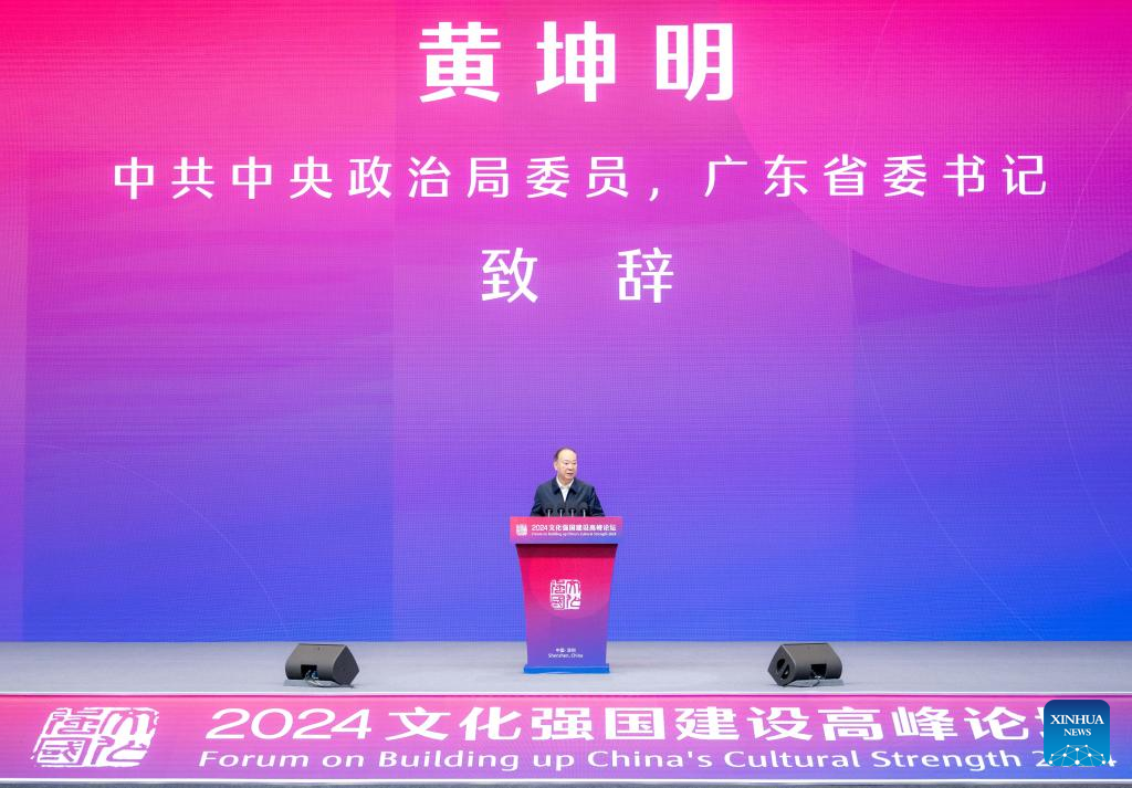 Huang Kunming, a member of the Political Bureau of the Communist Party of China (CPC) Central Committee and secretary of the CPC Guangdong Provincial Committee, attends and addresses the Forum on Building up China's Cultural Strength 2024 in Shenzhen, south China's Guangdong Province, May 23, 2024. (Xinhua/Zhai Jianlan)