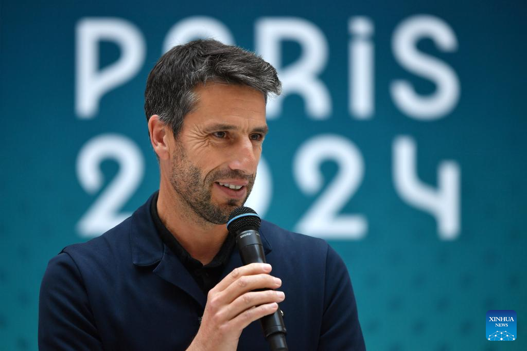 Tony Estanguet, president of the Paris 2024 Olympics and Paralympics Organising Committee, speaks during an unveiling ceremony of the podiums of the Paris 2024 Olympics and Paralympics held in Saint Denis, near Paris, France, May 23, 2024. (Photo by Julien Mattia/Xinhua)