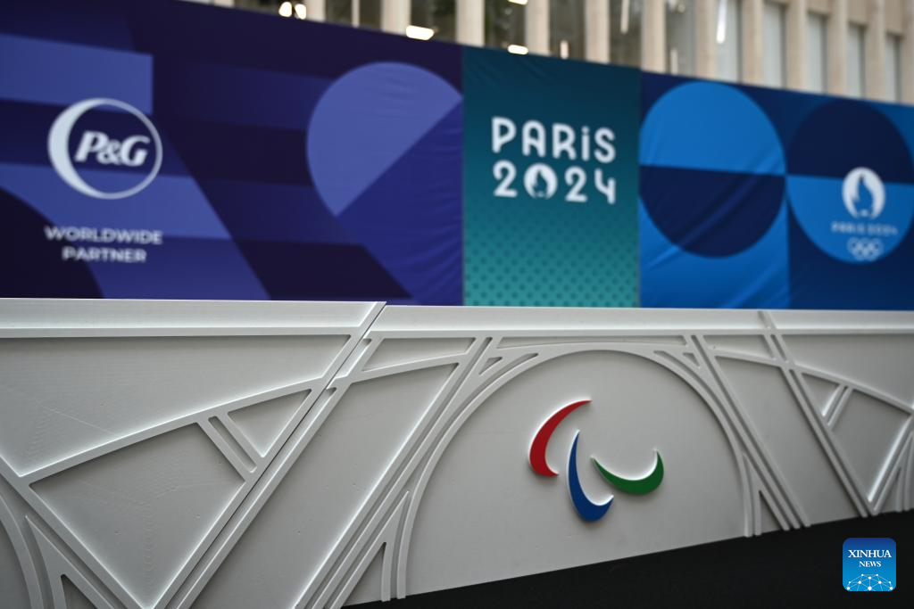 Photo taken on May 23, 2024 shows the details of the Paris 2024 Paralympics podium during an unveiling ceremony of the podiums of the Paris 2024 Olympics and Paralympics held in Saint Denis, near Paris, France. (Photo by Julien Mattia/Xinhua)