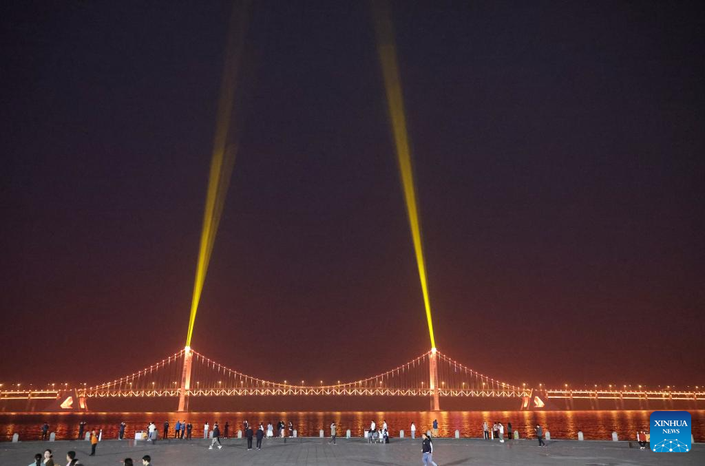 Tourists enjoy a light show near a bridge in Dalian, northeast China's Liaoning Province, May 23, 2024. (Xinhua/Li Gang)