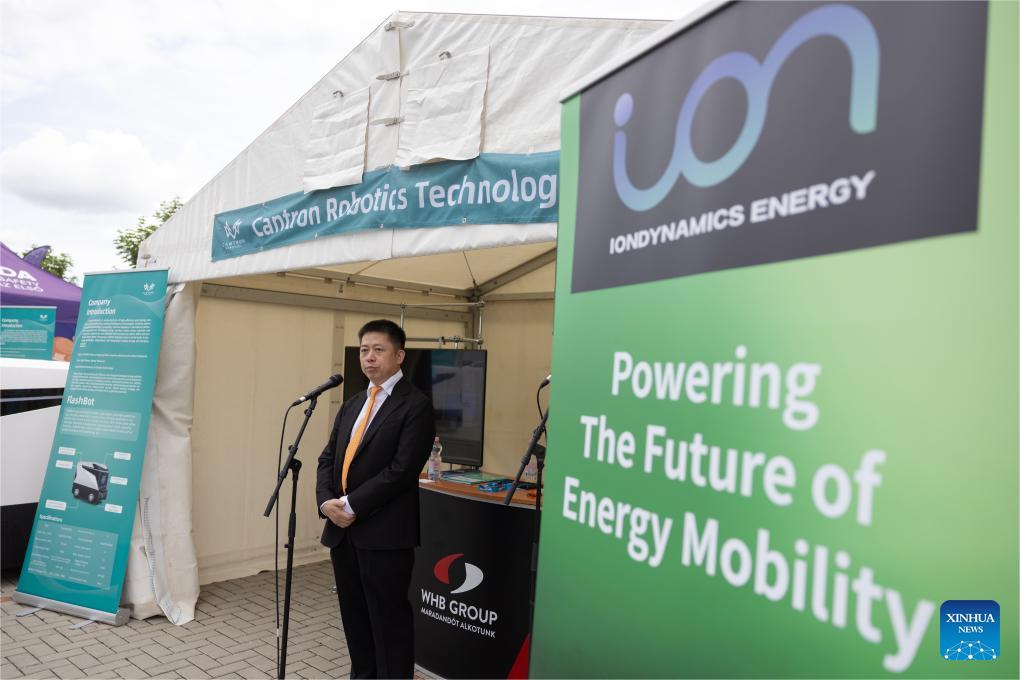 Tang Rui, founder and CEO of Shanghai Cantron Robotics, speaks during the GreenTech conference in Zalaegerszeg, Hungary, on May 23, 2024. Cutting-edge sustainable energy products from China were on display at the Greentech conference in Zalaegerszeg this week, drawing the attention of industry leaders and government officials. (Photo by Attila Volgyi/Xinhua)