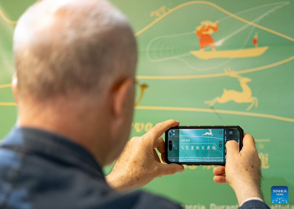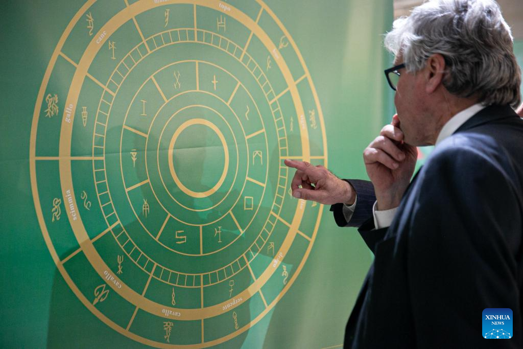 Visitor learn about Chinese sexagenary cycles at an exhibition themed "Code of Civilization in Chinese Characters" in Rome, Italy, May 24, 2024. (Xinhua/Li Jing)