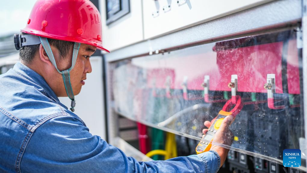 A staff member checks an electric transducer at Panjiang million-kilowatt photovoltaic base project in Bouyei-Miao Autonomous County of Guanling, southwest China's Guizhou Province, on May 23, 2024. The first phase of the project has recently started uploading power to the grid at its full capacity. (Xinhua/Tao Liang)