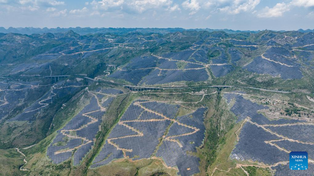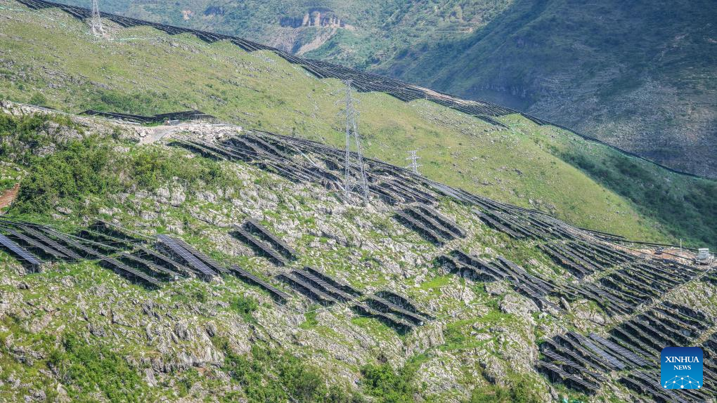 An aerial drone photo taken on May 23, 2024 shows a view of Panjiang million-kilowatt photovoltaic base project in Bouyei-Miao Autonomous County of Guanling, southwest China's Guizhou Province. The first phase of the project has recently started uploading power to the grid at its full capacity. (Xinhua/Tao Liang)