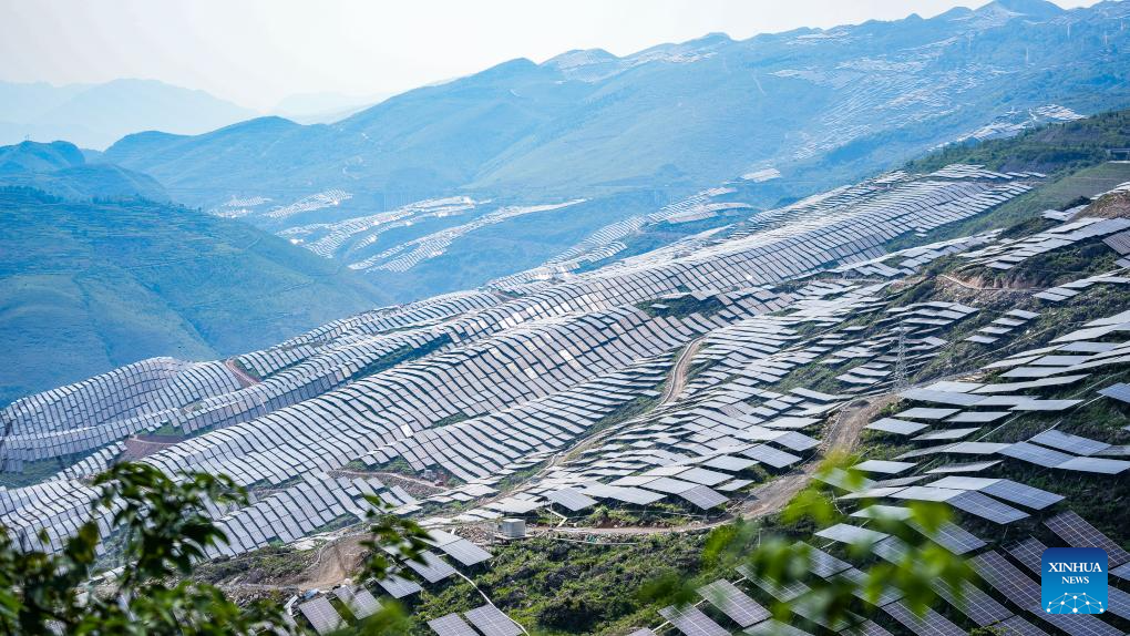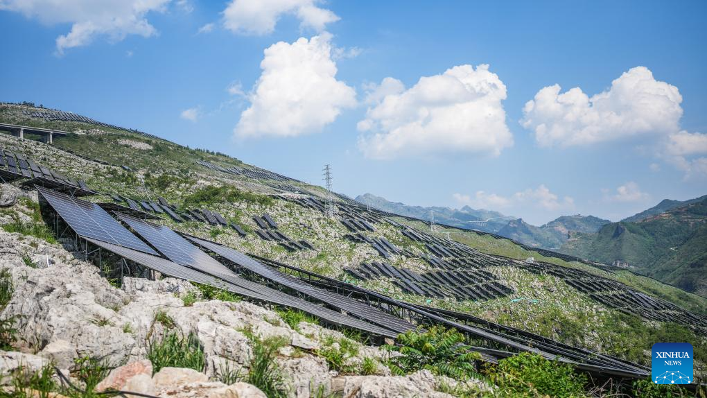 This photo taken on May 23, 2024 shows a view of Panjiang million-kilowatt photovoltaic base project in Bouyei-Miao Autonomous County of Guanling, southwest China's Guizhou Province. The first phase of the project has recently started uploading power to the grid at its full capacity. (Xinhua/Tao Liang)