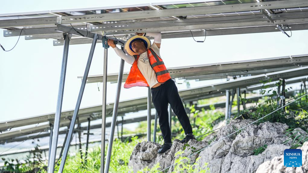 A staff member maintains and installs photovoltaic panels at Panjiang million-kilowatt photovoltaic base project in Bouyei-Miao Autonomous County of Guanling, southwest China's Guizhou Province, on May 23, 2024. The first phase of the project has recently started uploading power to the grid at its full capacity. (Xinhua/Tao Liang)