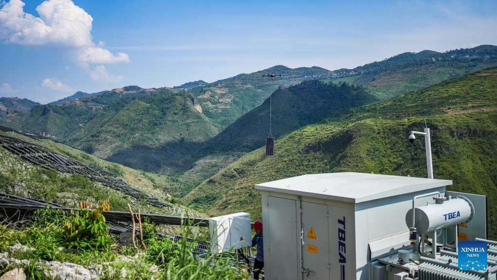 A drone delivers a photovoltaic panel at Panjiang million-kilowatt photovoltaic base project in Bouyei-Miao Autonomous County of Guanling, southwest China's Guizhou Province, May 23, 2024. The first phase of the project has recently started uploading power to the grid at its full capacity. (Xinhua/Tao Liang)