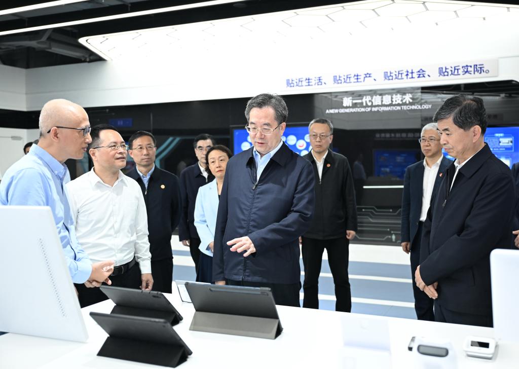 Chinese Vice Premier Ding Xuexiang, also a member of the Standing Committee of the Political Bureau of the Communist Party of China Central Committee, visits an exhibition hall of the Fuzhou Software Park in Fuzhou, southeast China's Fujian Province, May 23, 2024. Ding delivered a keynote speech at the opening ceremony of the 7th Digital China Summit in Fuzhou on Friday. During his stay in Fujian, Ding visited the Fuzhou Software Park, local tech company Rockchip Electronics Co., Ltd., Xiamen University and the Tan Kah Kee Innovation Laboratory. (Xinhua/Yan Yan)