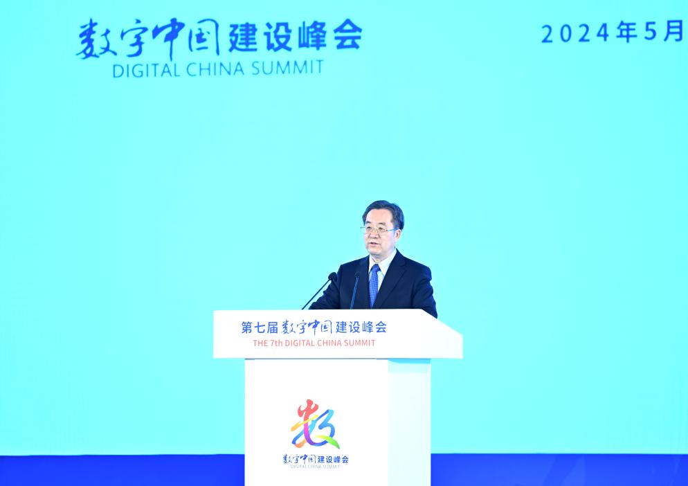 Chinese Vice Premier Ding Xuexiang, also a member of the Standing Committee of the Political Bureau of the Communist Party of China Central Committee, delivers a keynote speech at the opening ceremony of the 7th Digital China Summit in Fuzhou, southeast China's Fujian Province, May 24, 2024. (Xinhua/Yan Yan)
