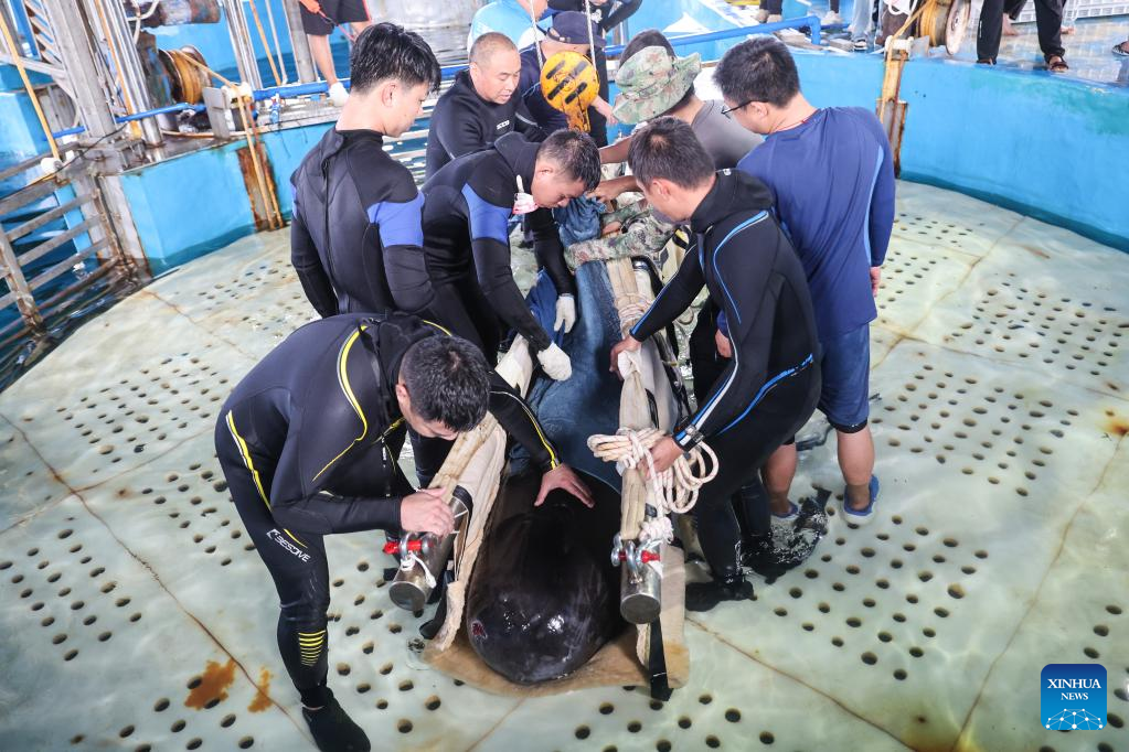 Staff members prepare to transfer the short-finned pilot whale "Haitang" at Sanya Haichang Animal Conservation Center in Sanya, south China's Hainan Province, May 25, 2024. (Xinhua/Zhang Liyun)