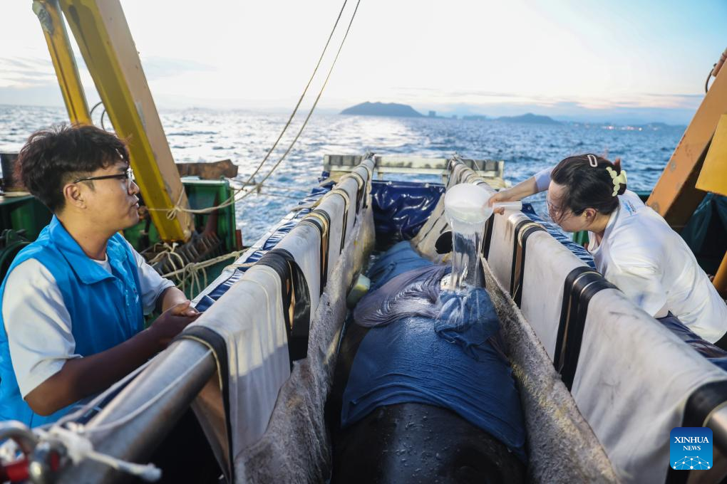 A volunteer checks the condition of the short-finned pilot whale "Haitang" on a scientific research ship, May 25, 2024. (Xinhua/Zhang Liyun)