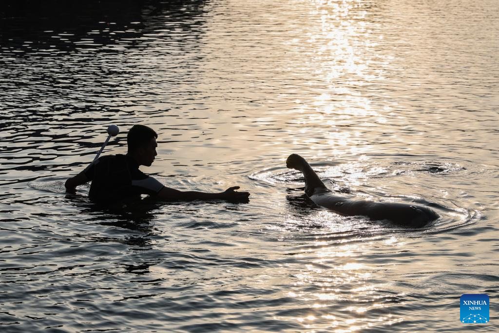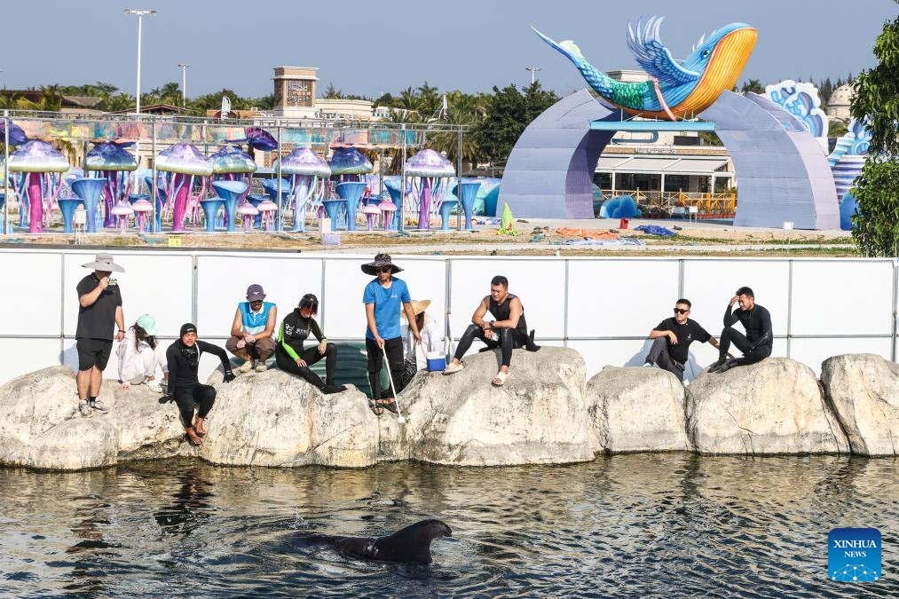 Breeders takes care of the short-finned pilot whale "Haitang" at Sanya Haichang Animal Conservation Center in Sanya, south China's Hainan Province, Jan. 9, 2024. (Xinhua/Zhang Liyun)