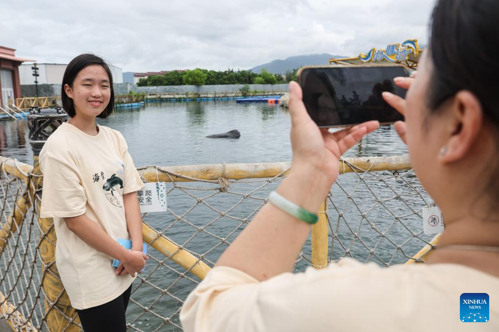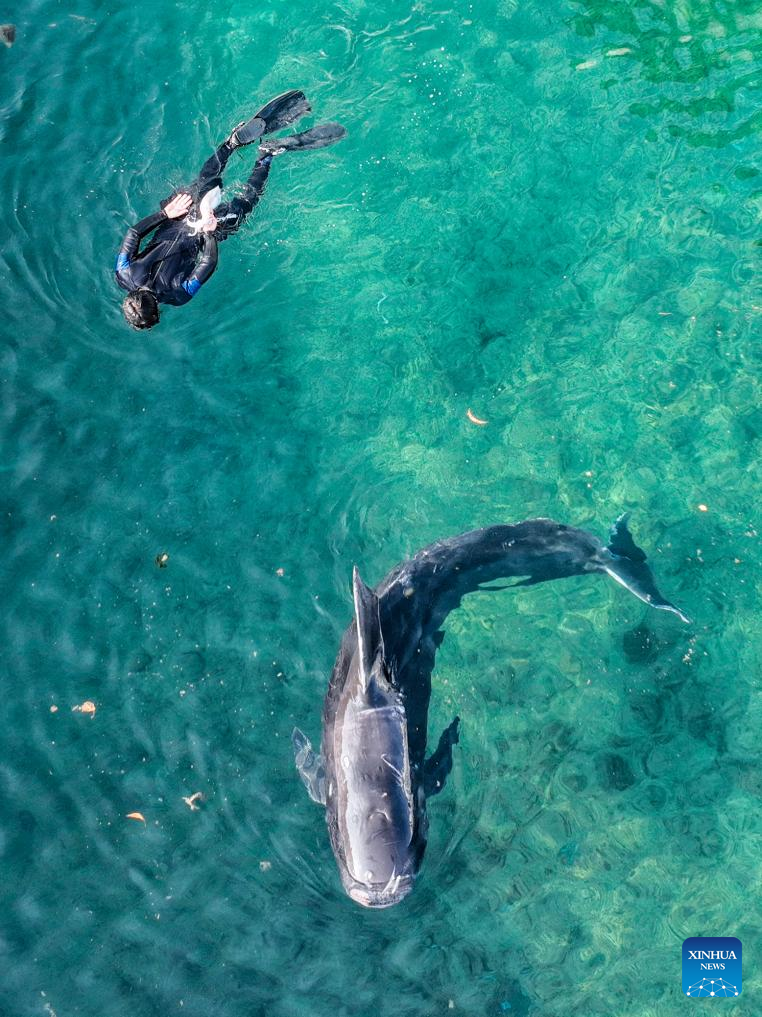 A breeder takes care of the short-finned pilot whale "Haitang" at Sanya Haichang Animal Conservation Center in Sanya, south China's Hainan Province, Jan. 21, 2024. (Xinhua/Zhang Liyun)