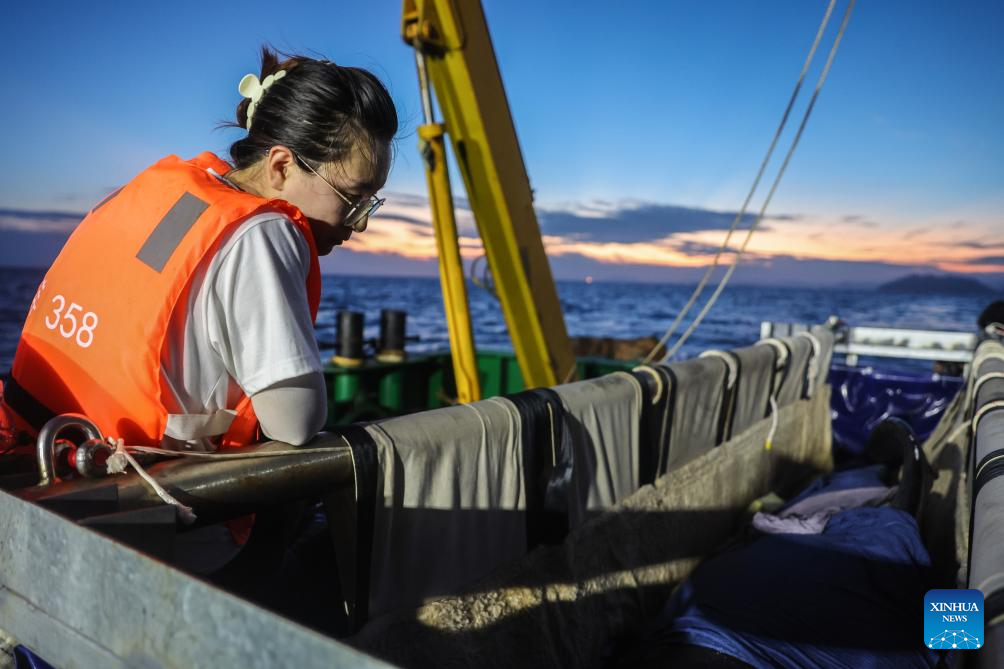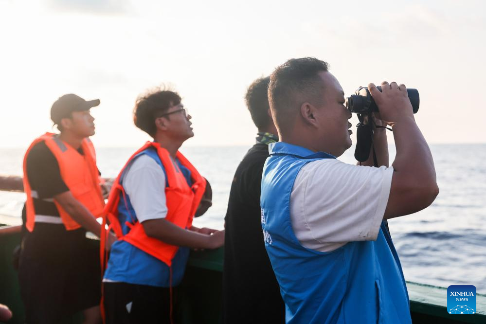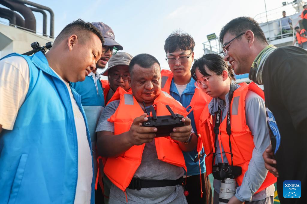 People wave goodbye to the short-finned pilot whale "Haitang" on a scientific research ship, May 26, 2024. (Xinhua/Zhang Liyun)