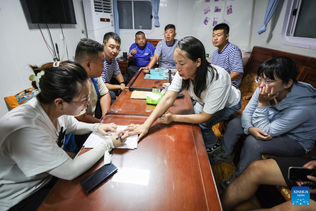 Staff members discuss the plan of releasing the short-finned pilot whale "Haitang" into the sea on a scientific research ship, May 25, 2024. (Xinhua/Zhang Liyun)