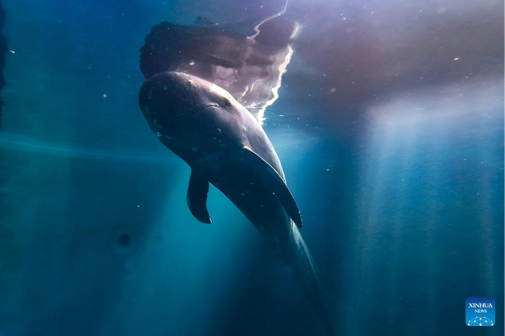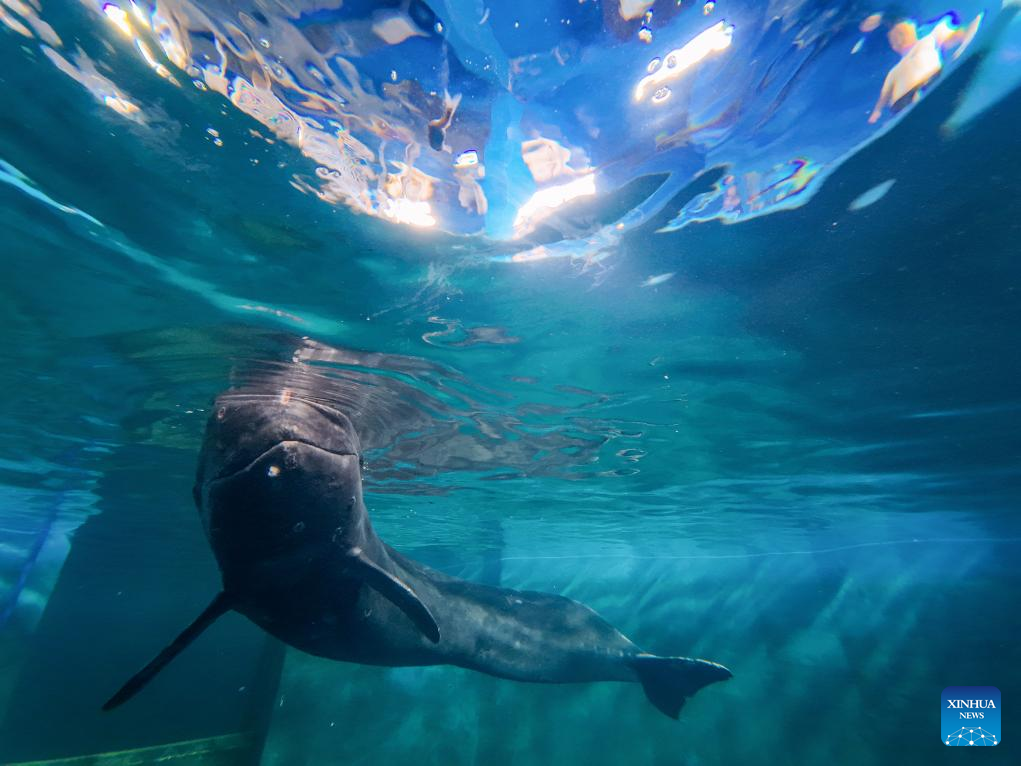 The short-finned pilot whale "Haitang" is pictured at Sanya Haichang Animal Conservation Center in Sanya, south China's Hainan Province, Jan. 10, 2024. (Xinhua/Zhang Liyun)