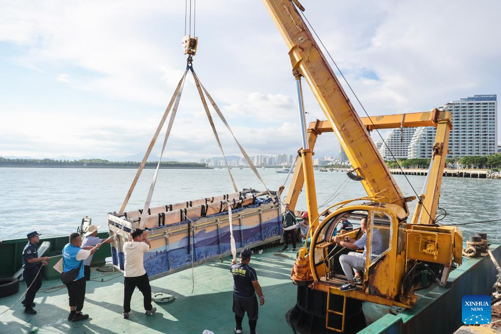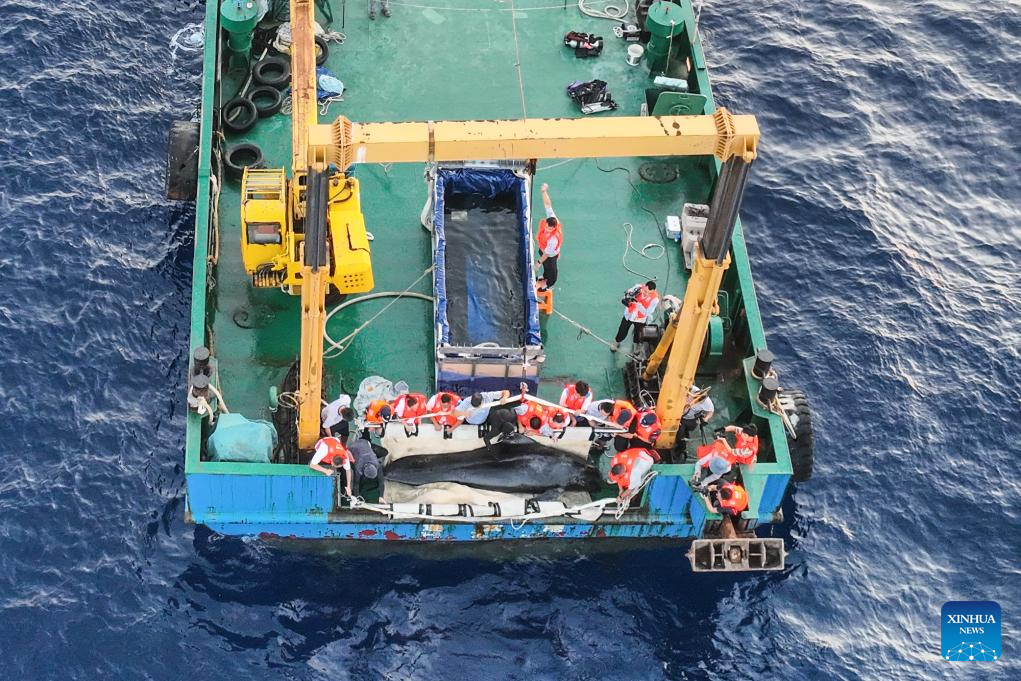 The short-finned pilot whale "Haitang" is transferred to a scientific research ship at a wharf in Sanya, south China's Hainan Province, May 25, 2024. (Xinhua/Zhang Liyun)