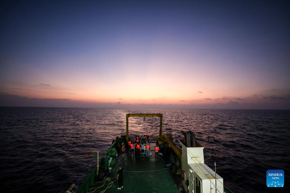 Staff members see off the short-finned pilot whale "Haitang" on a scientific research ship, May 26, 2024. (Xinhua/Zhang Liyun)