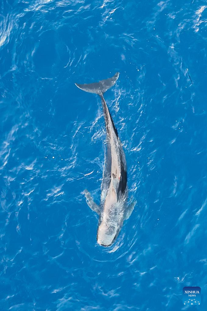 An aerial drone photo taken on May 26, 2024 shows the short-finned pilot whale "Haitang" swimming in the sea. (Xinhua/Zhang Liyun)
