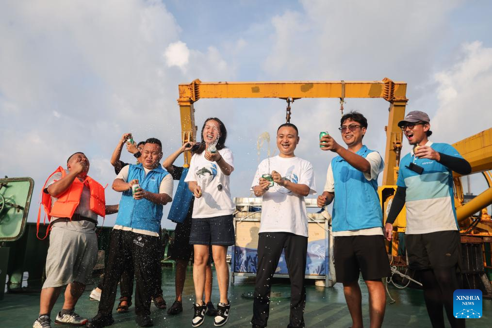 Staff members celebrate after releasing the short-finned pilot whale "Haitang" into the sea on a scientific research ship, May 26, 2024. (Xinhua/Zhang Liyun)