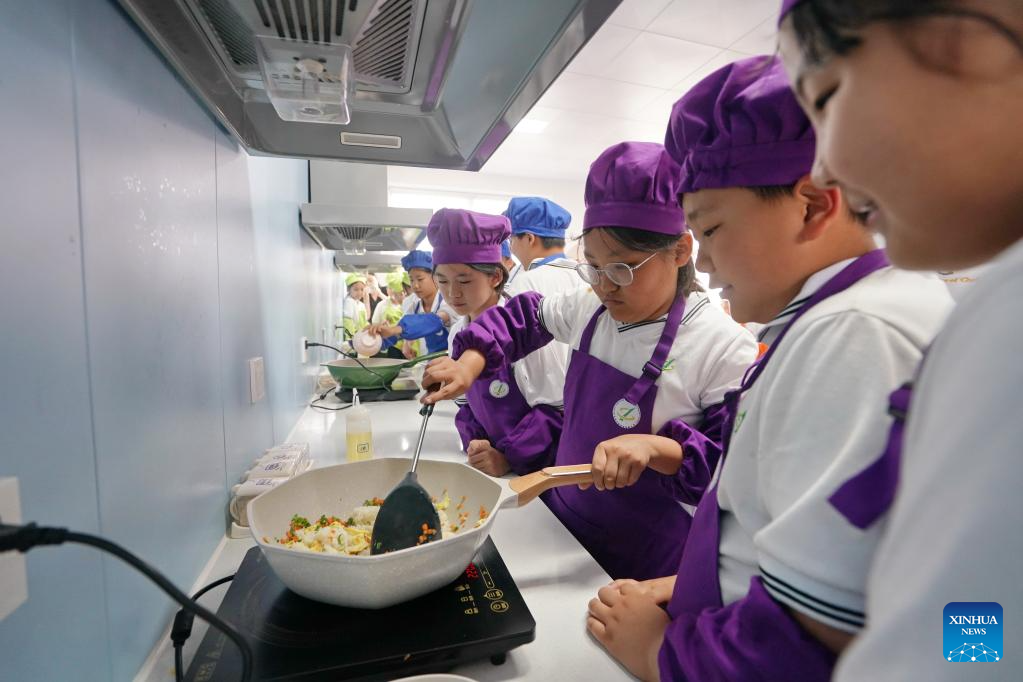 Students cook during a culinary class at a primary school in Xiong'an New Area, north China's Hebei Province, May 22, 2024. In recent years, Xiong'an New Area has continuously promoted the high-quality education construction. The area has introduced innovative education development system, constructed high-standard education facilities, and introduced professional education resources. Currently, the area has 717 schools, with 235,000 students and 20,000 teachers. (Xinhua/Mu Yu)