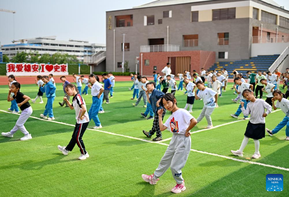 Students participate in outdoor activities at the Xiong'an campus of the Shijiahutong Elementary School in Xiong'an New Area, north China's Hebei Province, May 21, 2024. In recent years, Xiong'an New Area has continuously promoted the high-quality education construction. The area has introduced innovative education development system, constructed high-standard education facilities, and introduced professional education resources. Currently, the area has 717 schools, with 235,000 students and 20,000 teachers. (Xinhua/Mu Yu)