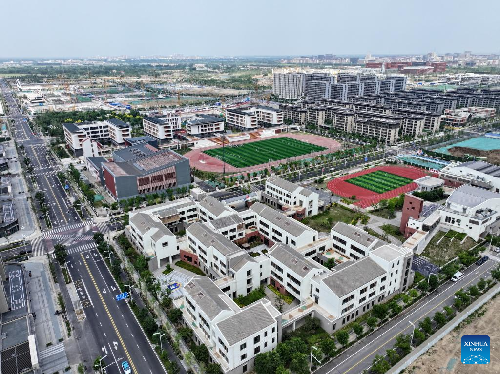 An aerial drone photo taken on May 21, 2024 shows a view of the Xiong'an campus of the Shijiahutong Elementary School and Beijing No. 4 High School in Xiong'an New Area, north China's Hebei Province. In recent years, Xiong'an New Area has continuously promoted the high-quality education construction. The area has introduced innovative education development system, constructed high-standard education facilities, and introduced professional education resources. Currently, the area has 717 schools, with 235,000 students and 20,000 teachers. (Xinhua/Mu Yu)