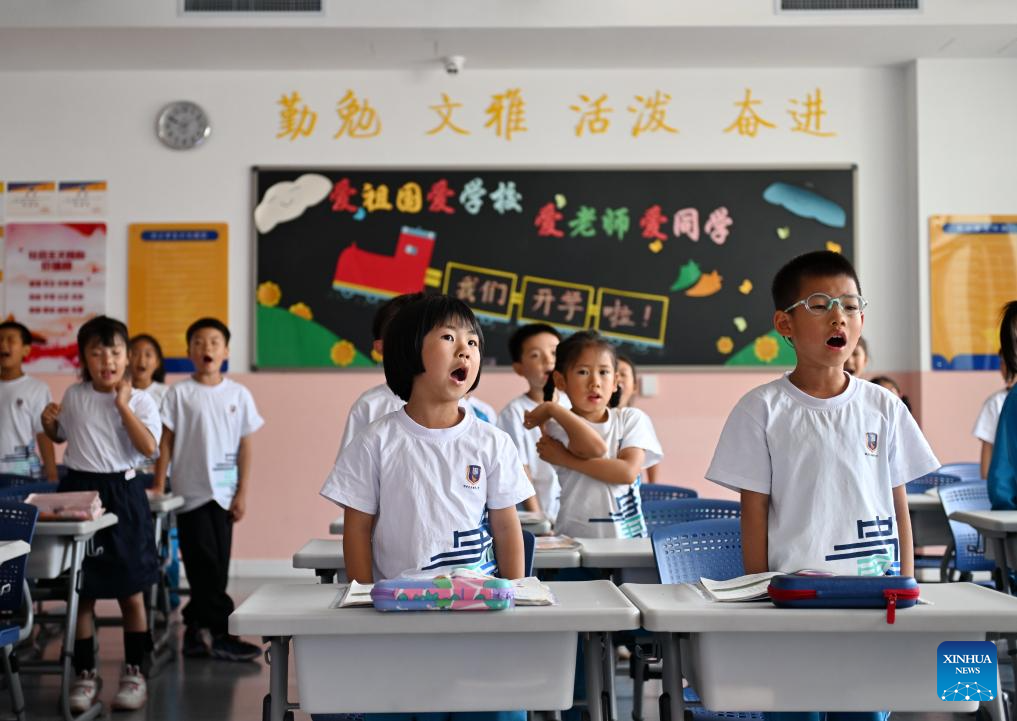 Students read loudly in a classroom at the Xiong'an campus of the Shijiahutong Elementary School in Xiong'an New Area, north China's Hebei Province, May 21, 2024. In recent years, Xiong'an New Area has continuously promoted the high-quality education construction. The area has introduced innovative education development system, constructed high-standard education facilities, and introduced professional education resources. Currently, the area has 717 schools, with 235,000 students and 20,000 teachers. (Xinhua/Mu Yu)