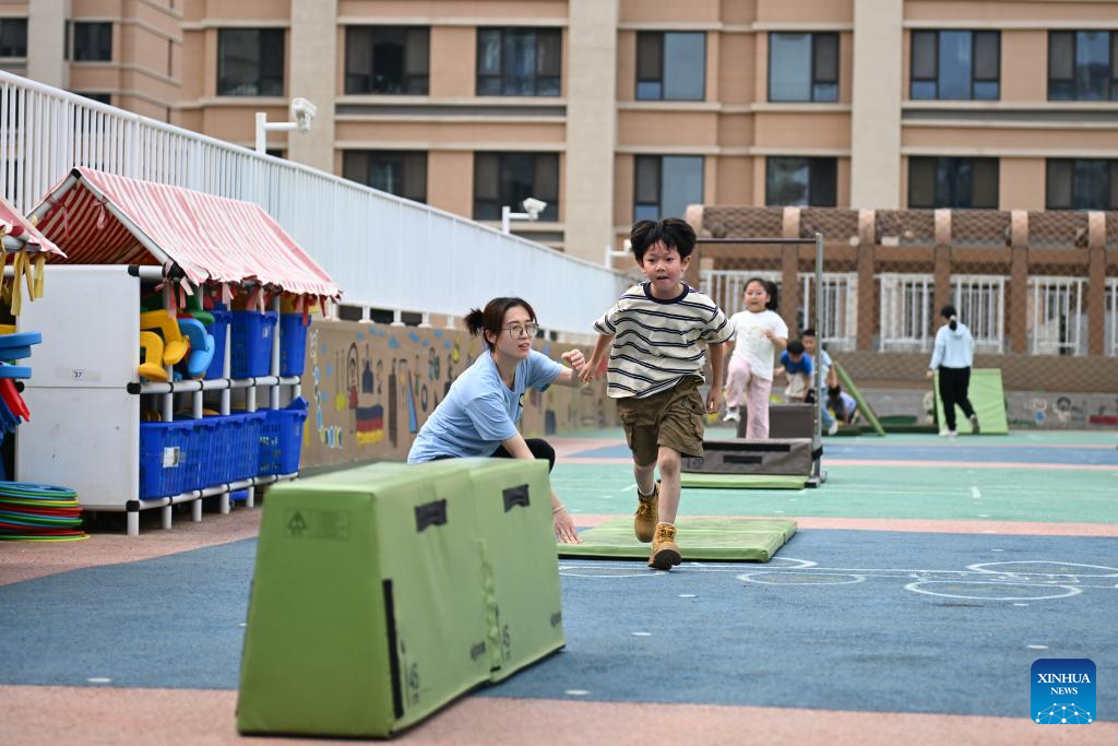Students participate in outdoor activities at a kindergarten in Xiong'an New Area, north China's Hebei Province, May 23, 2024. In recent years, Xiong'an New Area has continuously promoted the high-quality education construction. The area has introduced innovative education development system, constructed high-standard education facilities, and introduced professional education resources. Currently, the area has 717 schools, with 235,000 students and 20,000 teachers. (Xinhua/Mu Yu)