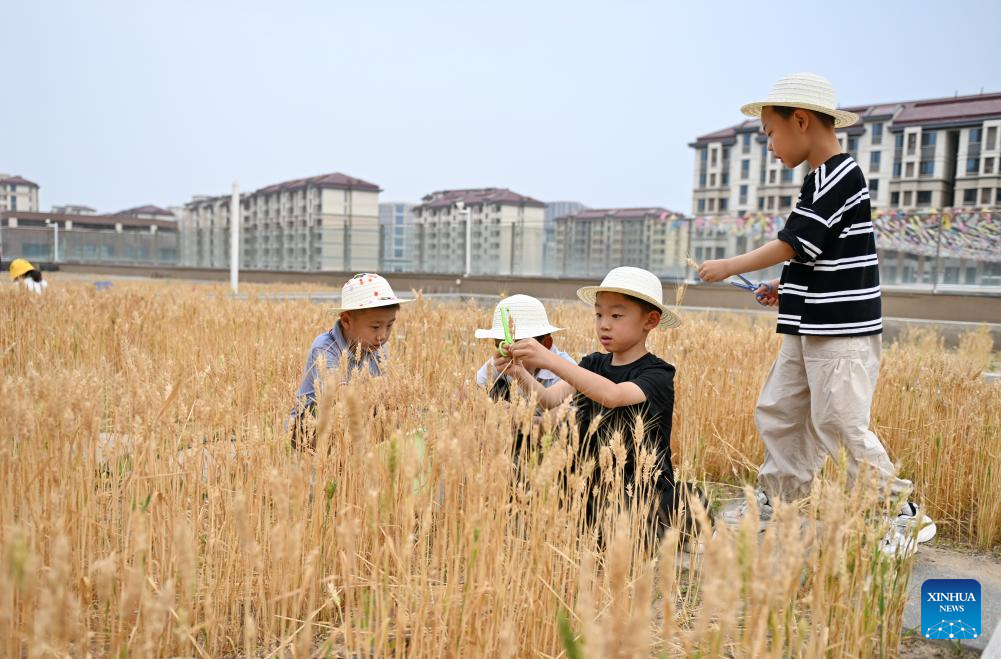 Students harvest wheat at a school farm of a kindergarten in Xiong'an New Area, north China's Hebei Province, May 23, 2024. In recent years, Xiong'an New Area has continuously promoted the high-quality education construction. The area has introduced innovative education development system, constructed high-standard education facilities, and introduced professional education resources. Currently, the area has 717 schools, with 235,000 students and 20,000 teachers. (Xinhua/Mu Yu)