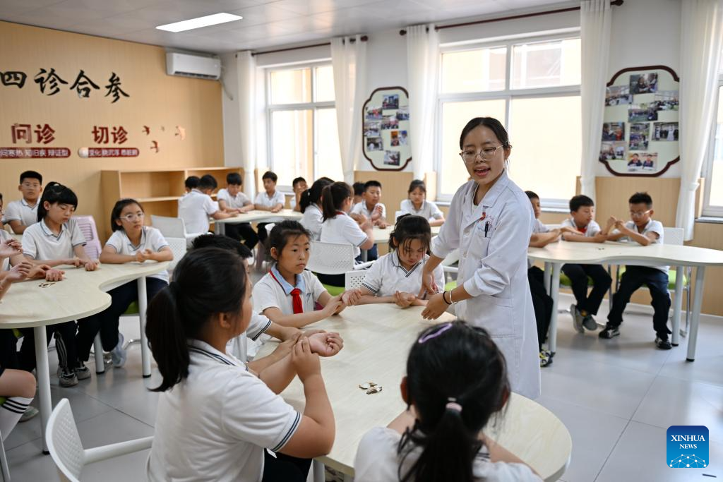 Students learn about traditional Chinese medicine knowledge at a primary school in Xiong'an New Area, north China's Hebei Province, May 22, 2024. In recent years, Xiong'an New Area has continuously promoted the high-quality education construction. The area has introduced innovative education development system, constructed high-standard education facilities, and introduced professional education resources. Currently, the area has 717 schools, with 235,000 students and 20,000 teachers. (Xinhua/Mu Yu)