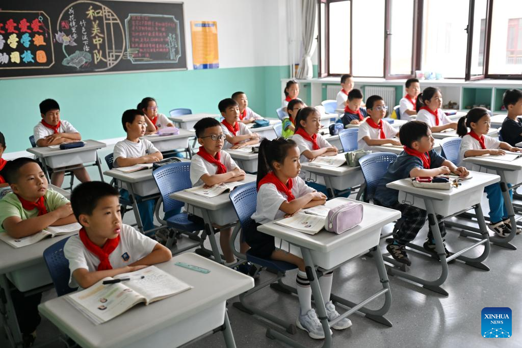 Students take classes at the Xiong'an campus of the Shijiahutong Elementary School in Xiong'an New Area, north China's Hebei Province, May 21, 2024. In recent years, Xiong'an New Area has continuously promoted the high-quality education construction. The area has introduced innovative education development system, constructed high-standard education facilities, and introduced professional education resources. Currently, the area has 717 schools, with 235,000 students and 20,000 teachers. (Xinhua/Mu Yu)