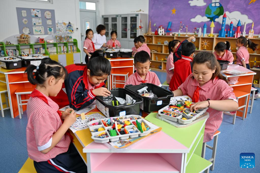 Students assemble robots at an activity room of a school in Xiong'an New Area, north China's Hebei Province, May 24, 2024. In recent years, Xiong'an New Area has continuously promoted the high-quality education construction. The area has introduced innovative education development system, constructed high-standard education facilities, and introduced professional education resources. Currently, the area has 717 schools, with 235,000 students and 20,000 teachers. (Xinhua/Mu Yu)