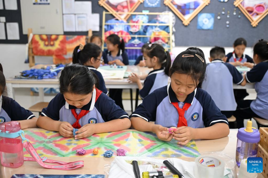 Students make batik works at a school in Xiong'an New Area, north China's Hebei Province, May 23, 2024. In recent years, Xiong'an New Area has continuously promoted the high-quality education construction. The area has introduced innovative education development system, constructed high-standard education facilities, and introduced professional education resources. Currently, the area has 717 schools, with 235,000 students and 20,000 teachers. (Xinhua/Mu Yu)