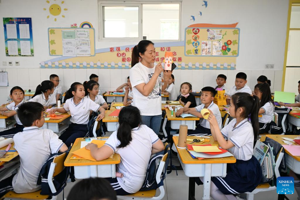 A teacher demonstrates as students look on in a handicraft class at a primary school in Xiong'an New Area, north China's Hebei Province, May 21, 2024. In recent years, Xiong'an New Area has continuously promoted the high-quality education construction. The area has introduced innovative education development system, constructed high-standard education facilities, and introduced professional education resources. Currently, the area has 717 schools, with 235,000 students and 20,000 teachers. (Xinhua/Mu Yu)