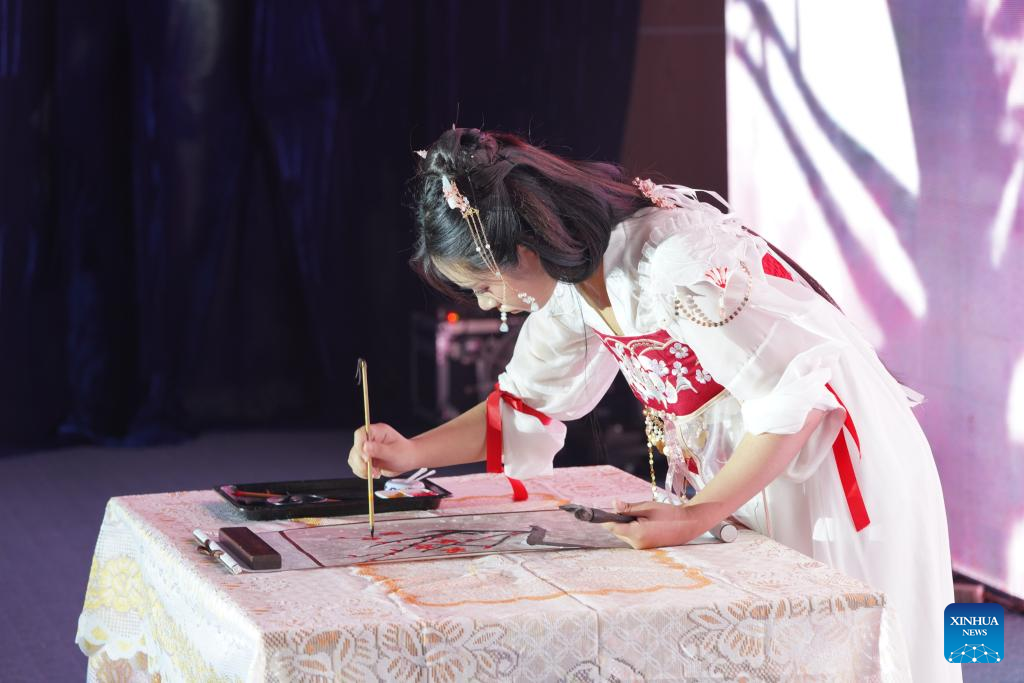 A contestant performs painting during the final round of the northern and central section of the 17th Chinese Bridge Chinese Proficiency Competition for Foreign High School Students in Hanoi, Vietnam, May 26, 2024. (Xinhua/Hu Jiali)