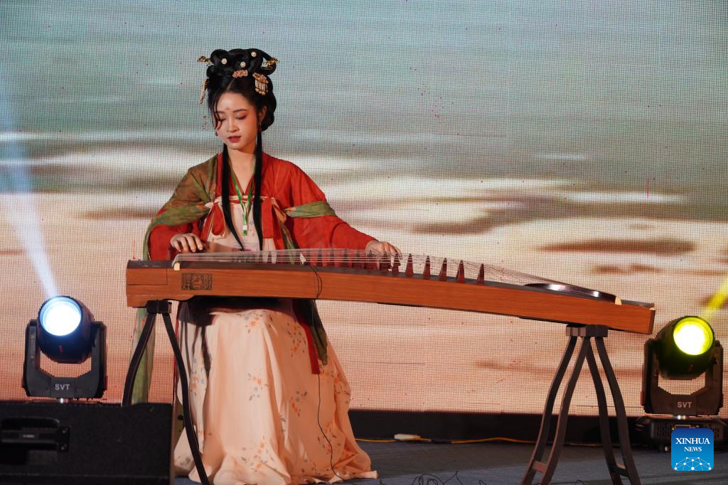A contestant plays guzheng, a traditional Chinese musical instrument, during the final round of the northern and central section of the 17th Chinese Bridge Chinese Proficiency Competition for Foreign High School Students in Hanoi, Vietnam, May 26, 2024. (Xinhua/Hu Jiali)